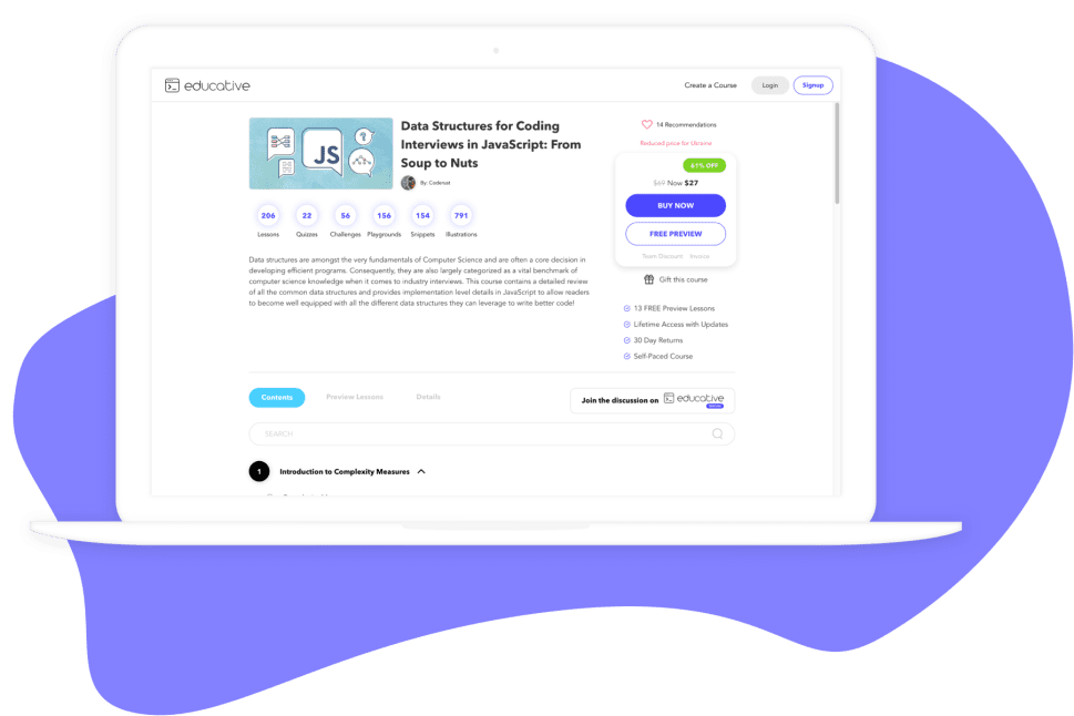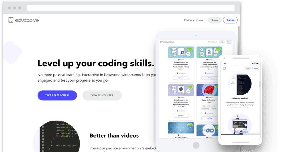 Educative is a web-based application with a responsive design. Its architecture is cloud-based and does not need any special system, software, or environment to build a new e-learning course. Even a person without technical background can launch a programming course on Educative.