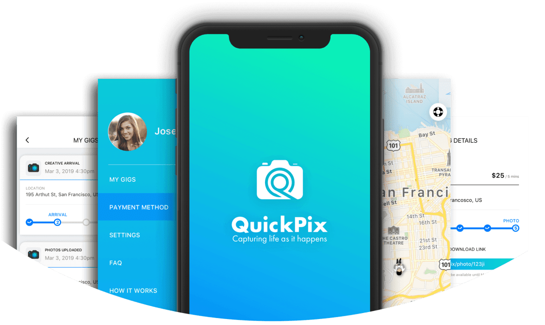 QuickPix is an Uber-like platform represented by two mobile apps that are specially designed to cater to the needs of both creatives and users. These applications are powerful tools for photographers to find a gig at any convenient time with no supervision, and for users to look for available creatives to take a pick of them at a required location. QuickPix is a convenient application for efficient on-demand photo services.